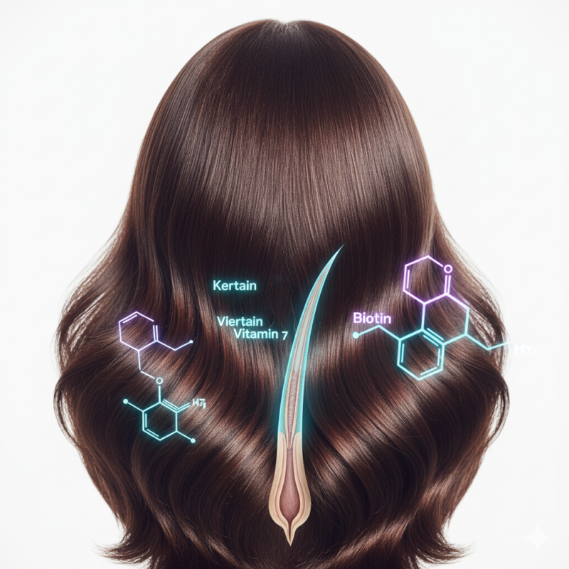 Biotin, also known as Vitamin B7, is essential for keratin production — the protein that makes up your hair.